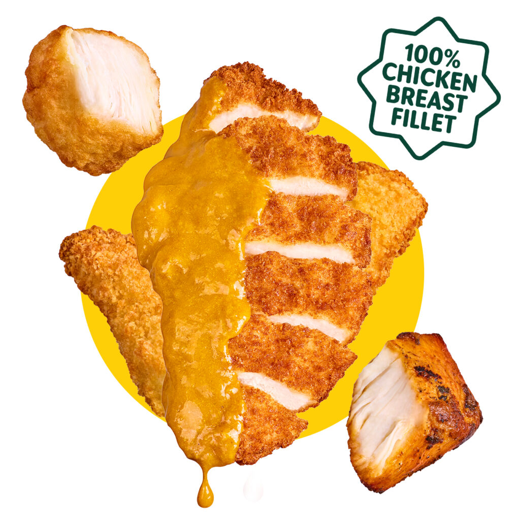 Chunky 'n juicy 'proper' chicken breast fillet nuggets in a crisp, golden coating.